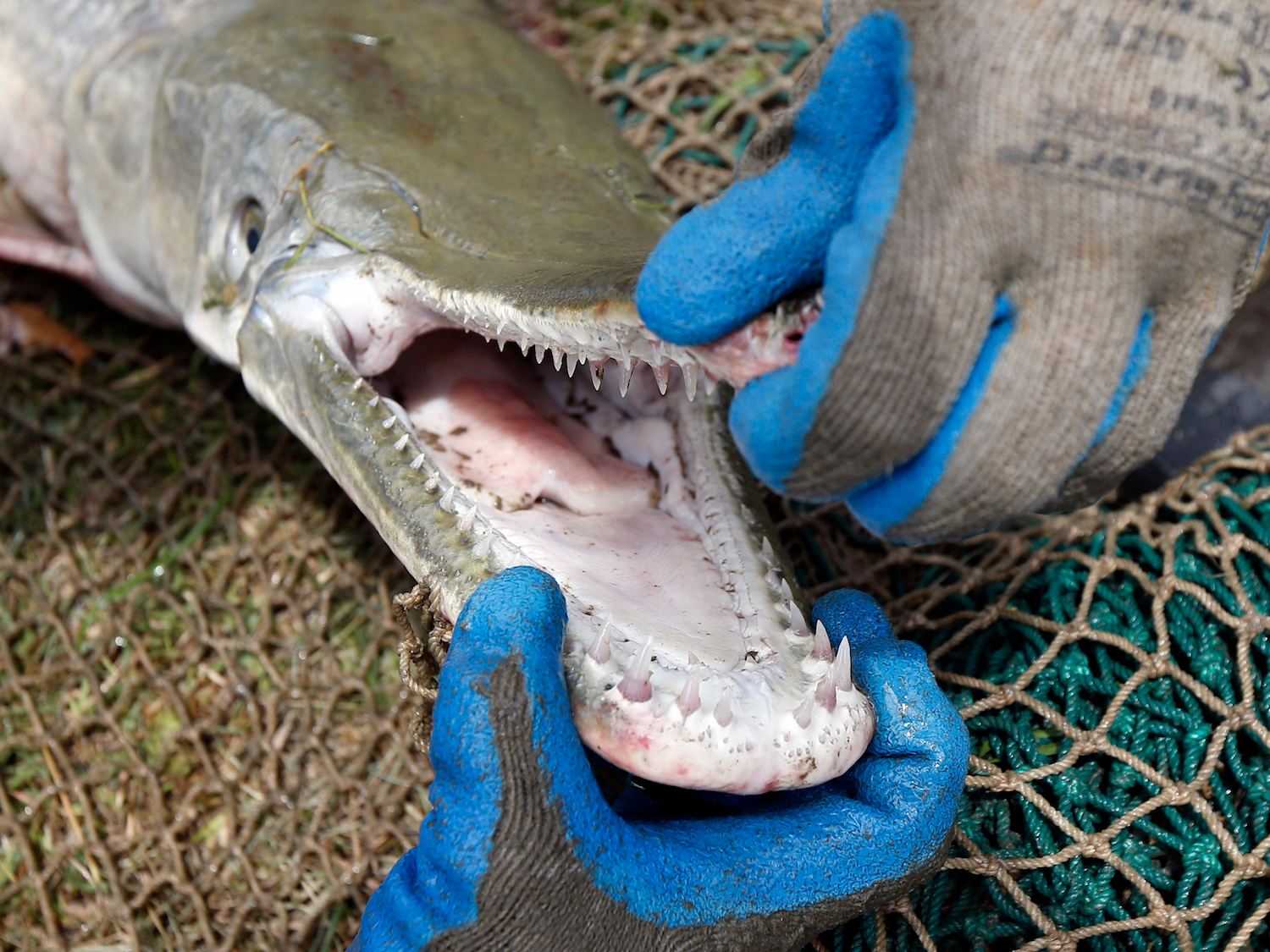 Alligator Gar Fish Teeth / The giant alligator gar is among the biggest freshwater fish in the world, but don't let the large teeth and fearsome appearance fool you.. The english common name for atractosteus spatula are alligator gar, gator, greater gar, garpike, garfish, and mississippi alligator gar. On average, an alligator gar goes through 2,000 to 3,000 . Gar is a member of an ancient holostean sequence of lepisostiformus (or . Alligator gars have about 80 teeth in total. It can grow up to 8 feet long and weigh more than 300 pounds.
